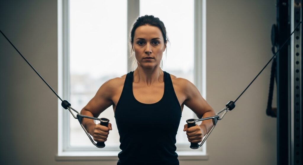 The movement requires constant tension from cables which creates unbroken resistance throughout the entire exercise process. The exercise requires you to pull cables from high to low while crossing your hands at the bottom which leads to strong muscle contractions that improve muscle definition and development of the inner chest.