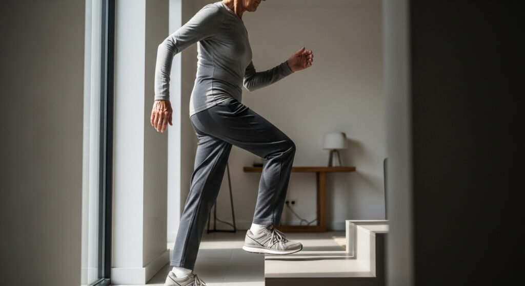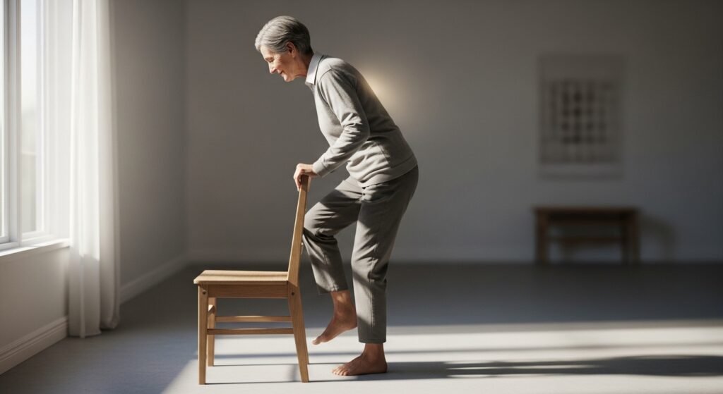 The calf muscles function as shock absorbers which protect you from impact during walking while they help you to jump upward. You should stand behind a chair and rise onto your tiptoes before you lower your body down. The exercise maintains your ankle flexibility while it stops the appearance of shuffling walking style which commonly occurs during aging.