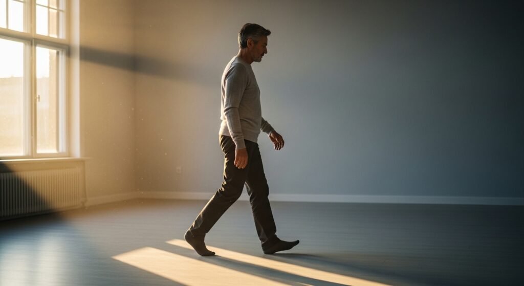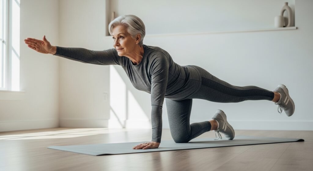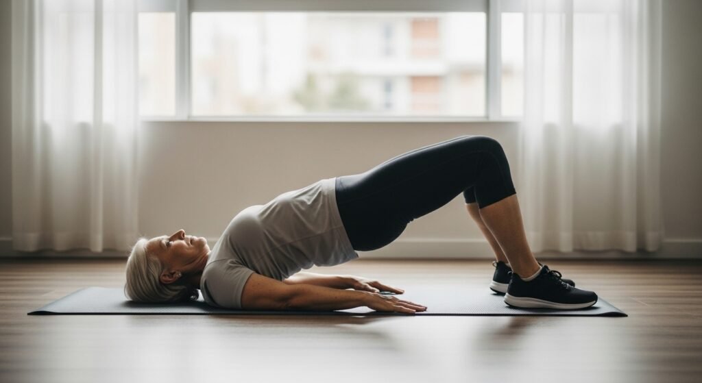 The strong glute muscles function as a protective shield for your lower back while they improve your walking efficiency. You should lie on your back with knees bent and feet flat before lifting your hips upward. The exercise “awakes” the posterior chain which becomes weak due to sitting and supports a normal walking pattern.