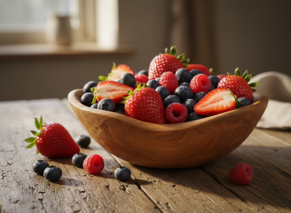 Blueberries, strawberries, and raspberries—small antioxidant fruits, red and blue and purple—are fighters against inflammation and guards from aging. They aren’t sickly sweet and are low on the glycemic index; hence it is guilt-free indulgence.
