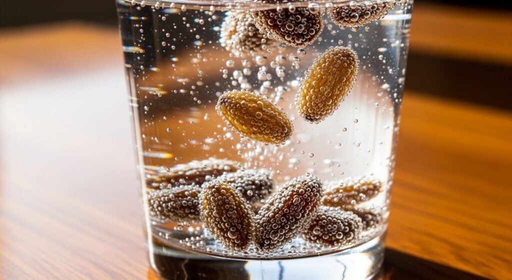 You should drop some raisins into a glass that contains clear carbonated soda. The raisins start at the bottom but they begin their “dance” upward followed by their descent back to the bottom. The carbon dioxide bubbles in the soda attach to the rough surface of the raisins acting like tiny life jackets that lift them up.