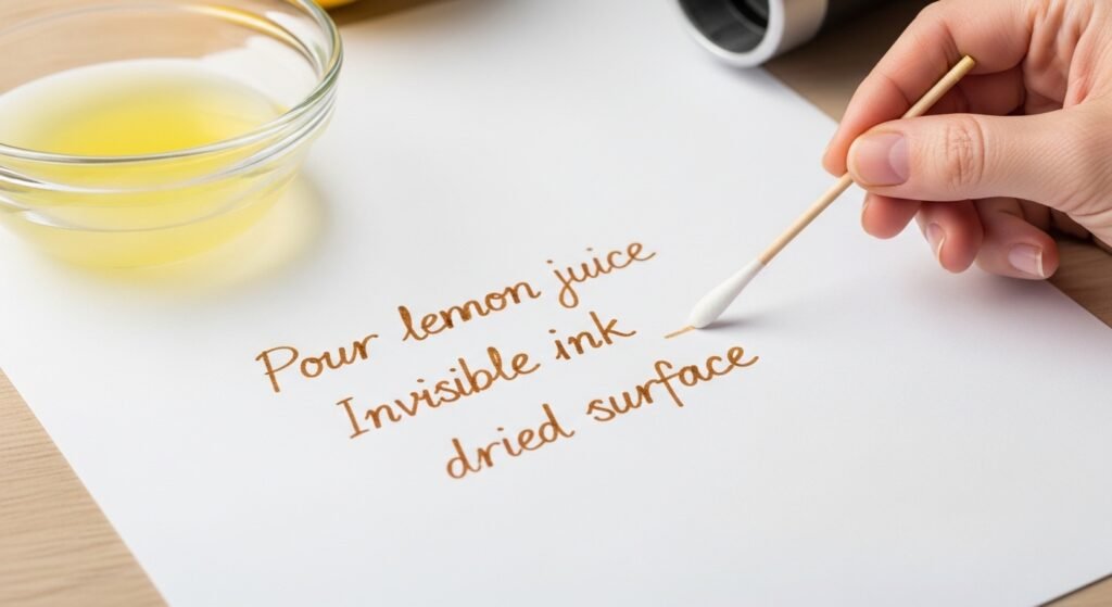 You must pour lemon juice into a bowl before you use a cotton swab to write an invisible message on white paper. The message becomes invisible following the dried surface process. The paper needs to be heated with a light bulb or hair dryer to reveal its secret message. The acidic juice undergoes oxidation through heat which causes it to develop a brown color .