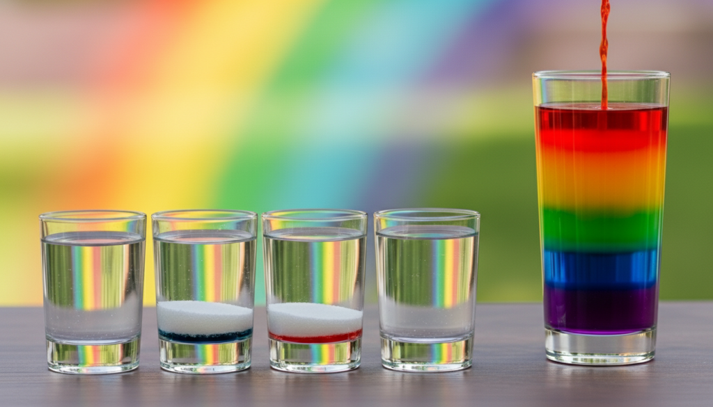 You need to fill four glasses of water with different amounts of sugar which will be distributed as 1 tbsp 2 tbsp 3 tbsp and 4 tbsp. Each glass should receive a different type of food coloring. The tall glass should receive different food coloring which should be layered starting with the densest color at the bottom. The colors remain separate because their different densities stop them from combining together.