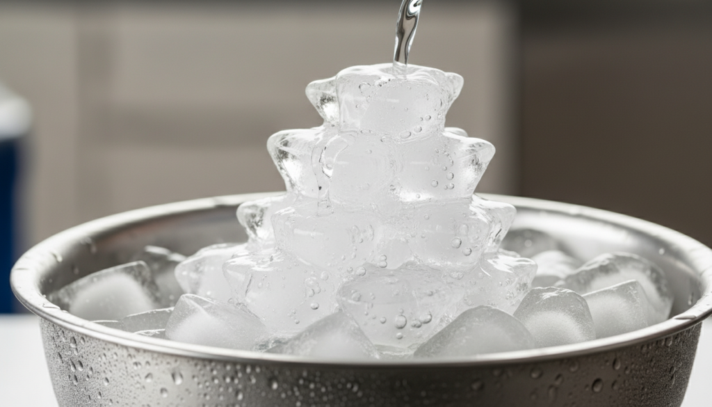You should place an unopened bottle of purified water into the freezer for two hours until it reaches a temperature just below freezing point. You should take out the frozen items and pour water onto the ice cube bowl. The water freezes immediately after it touches the surface which allows you to construct an ice tower.