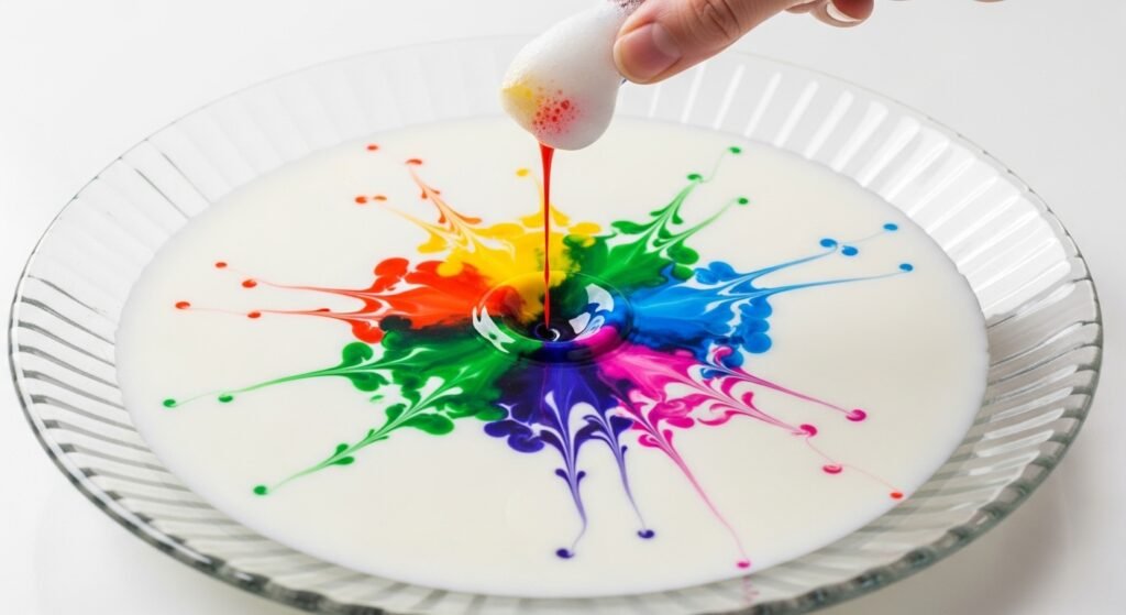 You need to fill a shallow plate with milk after which you should drop different food colors into the center of the plate. The soap should be dipped into dish soap before it touches the center of the colors. The soap causes the milk surface to break apart which leads to milk fat particles being chased away while color pigments move outward in explosion.