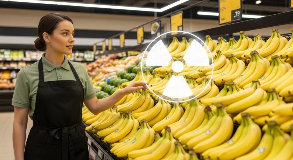 Bananas contain potassium-40 which acts as a radioactive isotope yet people should not worry about this fact. However, you would need to eat roughly 10 million bananas in one sitting to die from radiation poisoning. You will become sick from the sugar and fiber content of bananas much sooner than radiation will pose a danger to your health.