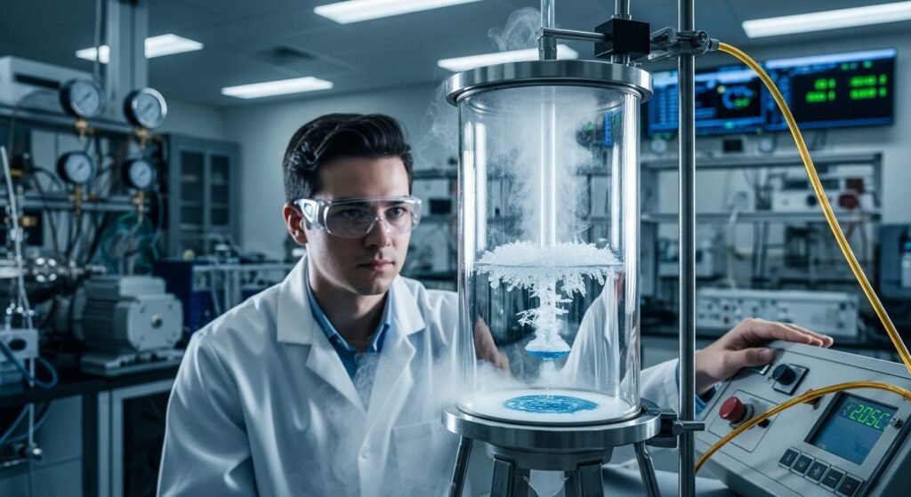The “Triple Point” exists at a particular temperature and pressure point. Water exists in three states of matter at that particular moment. The laboratory shows water in a strange state where it makes slushy movements between boiling and freezing.