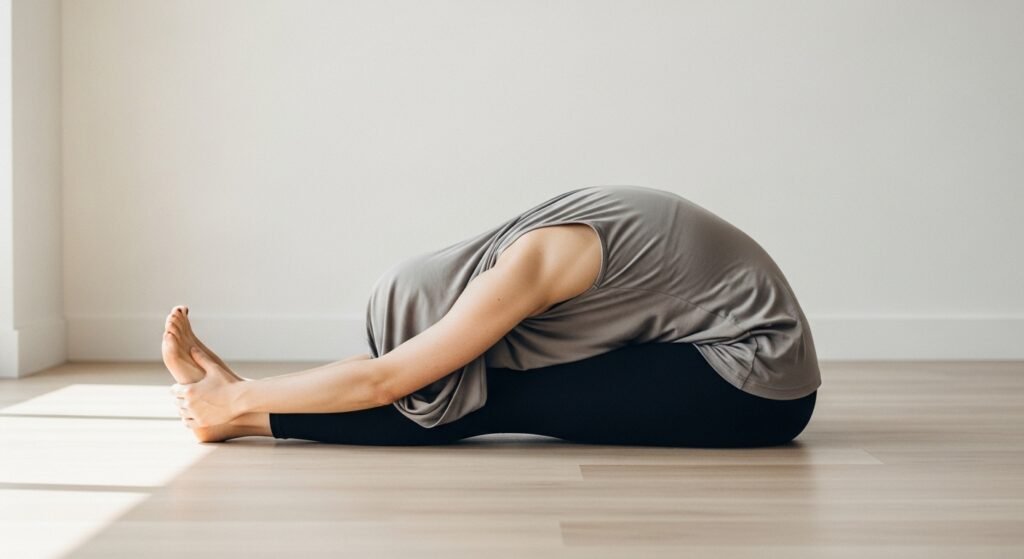 Seated forward fold with relaxed spine loads hamstrings and spinal ligaments. Legs extend, torso drapes without effort. Arms hang or rest on blocks. A four minute hold suits the mid session peak, supported by slow breathing and minimal movement.