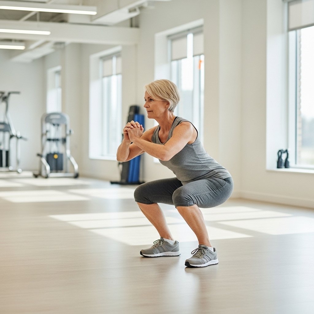 In the sixties, balance and joint comfort shape squat performance. Geriatric fitness research associates 20 to 30 squats with preserved independence. Use of bodyweight only, stable footwear, and rest pauses improves consistency and reduces unnecessary joint strain.