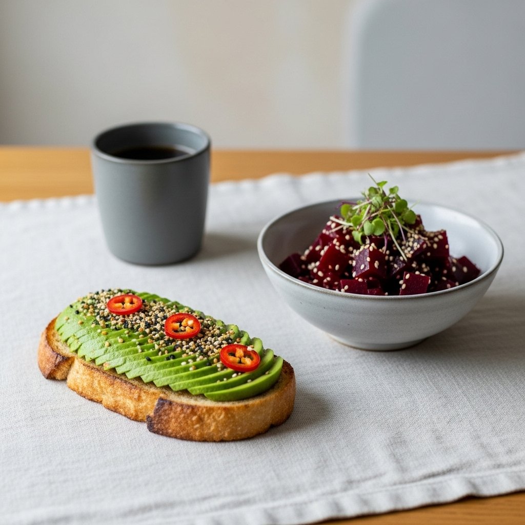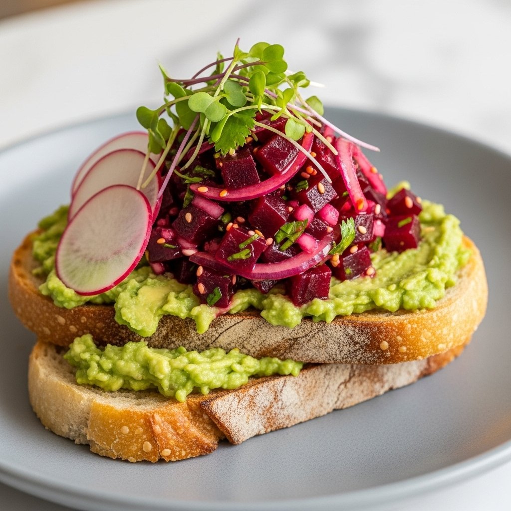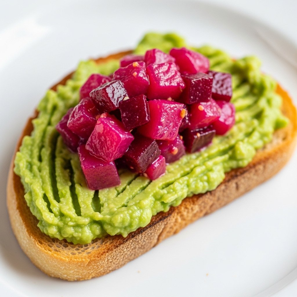 Toast offers a hard crust that has structural support. Avocado gives it creaminess and beet poke gives it firmness. The contrast of texture enhances the clarity of bites and decreases fatigue of palate. The slower eating rates on balanced textures are in line with mindful actions of eating portions reported in nutrition studies.