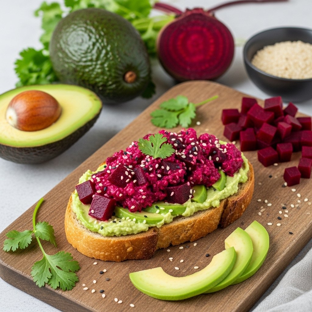 Standard slices of bread define portion boundaries. Avocado spread thickness remains measurable by weight. Beet poke volume remains visible on the surface. Clear portion cues support calorie awareness and reduce over serving risk during preparation.