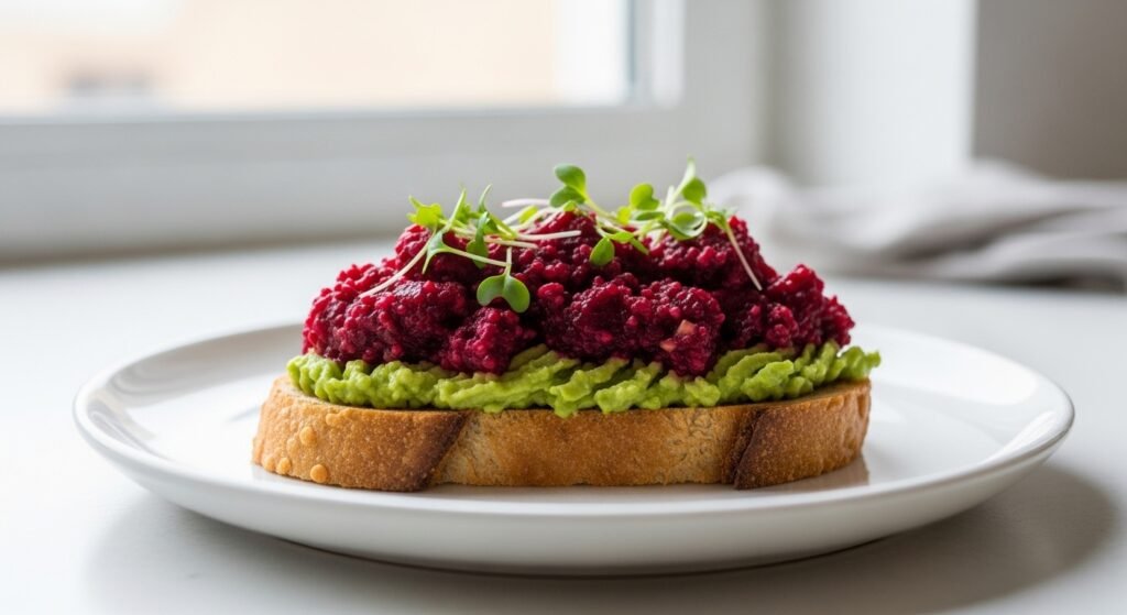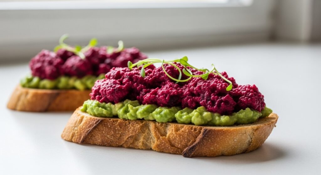 Toast offers a hard crust that has structural support. Avocado gives it creaminess and beet poke gives it firmness. The contrast of texture enhances the clarity of bites and decreases fatigue of palate. The slower eating rates on balanced textures are in line with mindful actions of eating portions reported in nutrition studies.