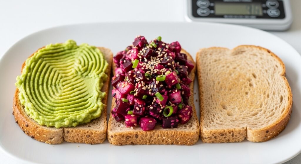 Standard slices of bread define portion boundaries. Avocado spread thickness remains measurable by weight. Beet poke volume remains visible on the surface. Clear portion cues support calorie awareness and reduce over serving risk during preparation.