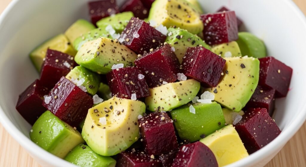 Avocado supplies a soft green base with neutral fat content. Beet poke contributes deep red tones from natural pigments. The contrast improves plate clarity and portion visibility. Food studies show bright color variation increases perceived freshness during meal selection, which supports presentation goals for cafés and home cooks.