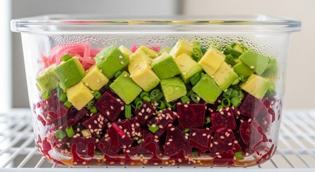Beet poke stores well under refrigeration for short periods. Avocado preparation requires close timing to service to limit browning. Acidic elements slow color change. Clear storage practices maintain appearance and reduce ingredient waste.