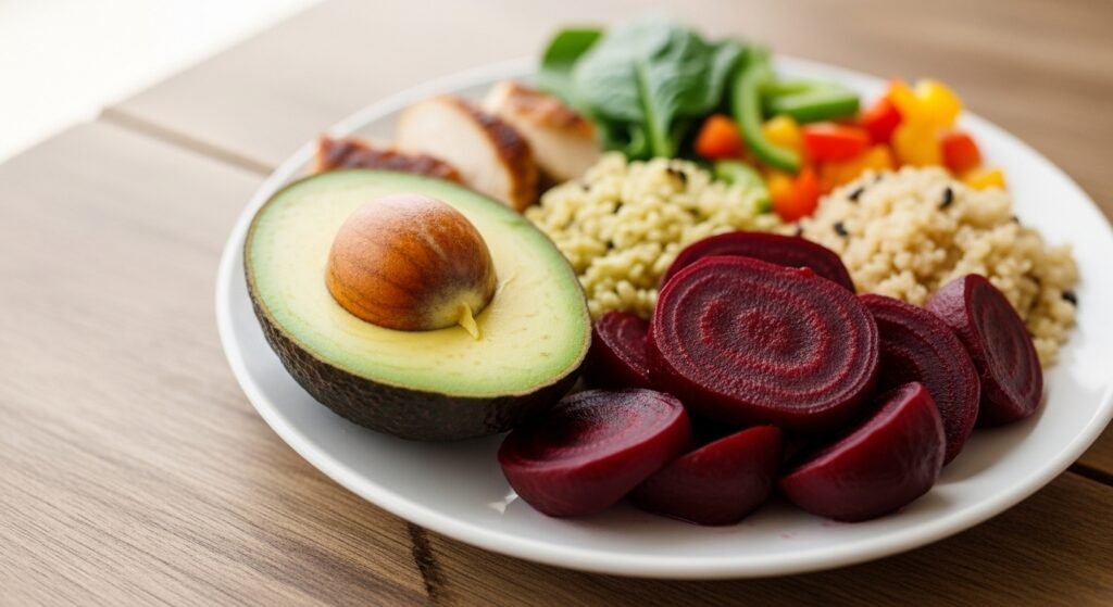 Avocado provides monosaturated fats and fiber. Beets are folic acid and nitrated corpus callosum associated with circulation research. Combined serves can make nutrients more diverse without making the serving large. Balanced plate frameworks are applied in nutrition planning and are in line with such combinations.