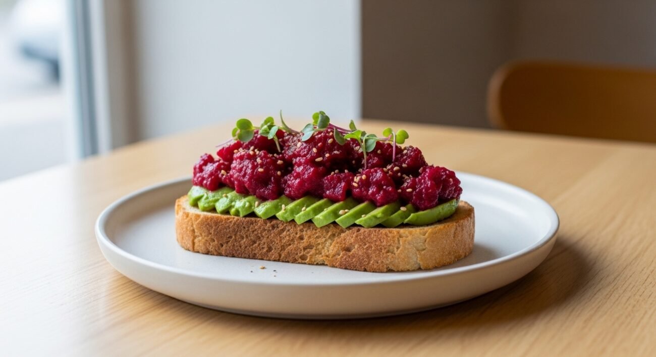 Standard slices of bread define portion boundaries. Avocado spread thickness remains measurable by weight. Beet poke volume remains visible on the surface. Clear portion cues support calorie awareness and reduce over serving risk during preparation.