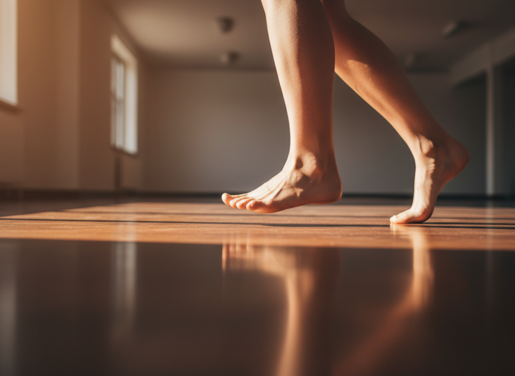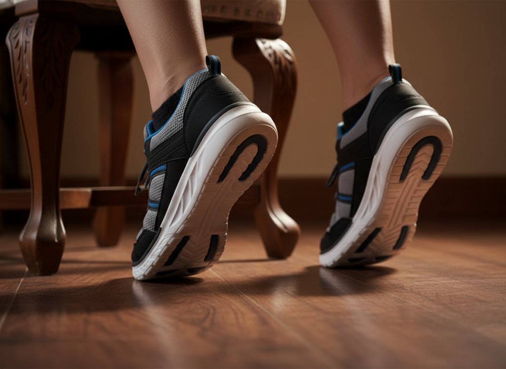 Ankle Heel raises help in strengthening the ankle and improving balance. The person is standing behind a chair and raises and drops off the floor with heels raised. Ten repetitions are favourable to calf muscles. The chair has light hand support that provides stability when moving.