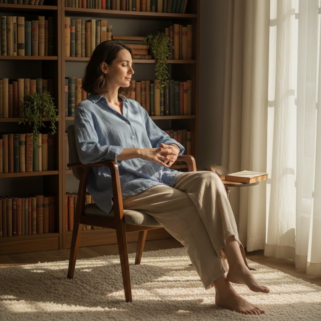 Sitting torso rotation facilitates spinal movement. The person sits erectly and turns his or her side to side very softly. Eight rotations on each side are flexible. Advanced slowness prevents dizziness and promotes comfort.