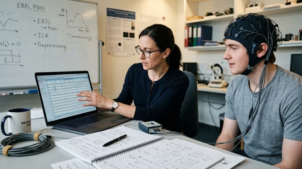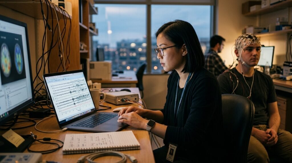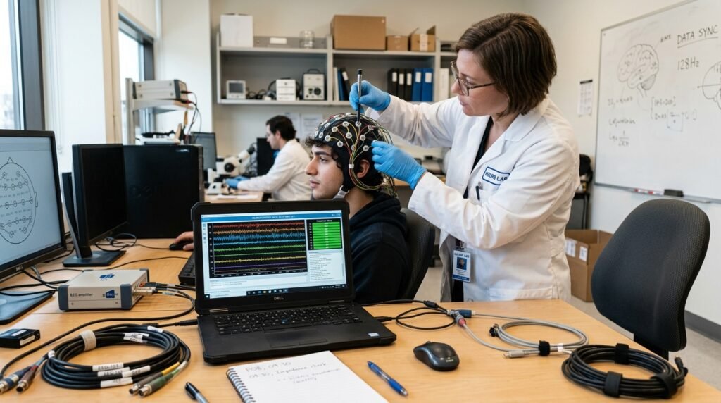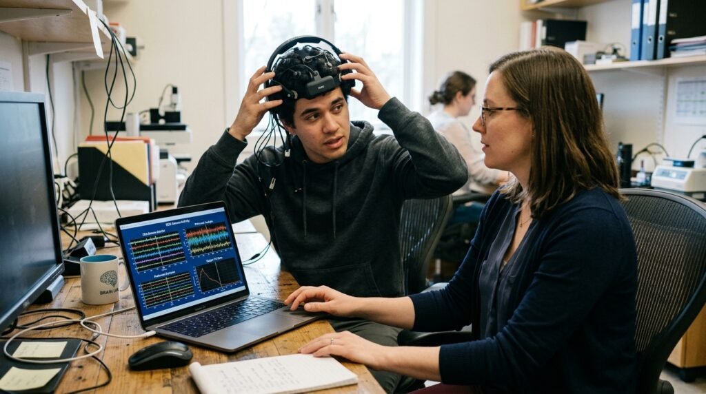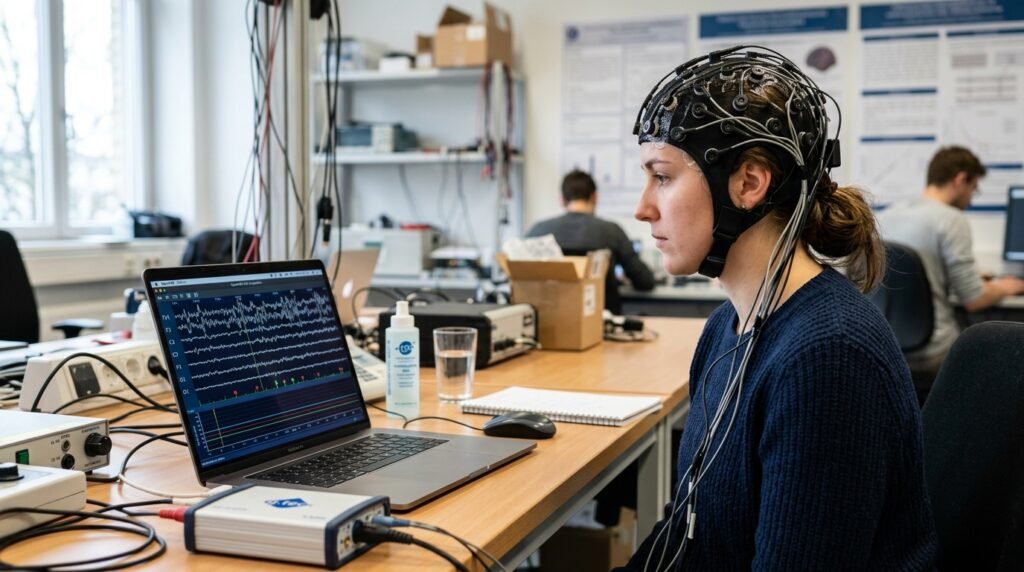 Devices using EEG sensors can capture electrical activity from the brain. During the test, participants wore headsets that recorded signals, showing that technology can identify general mental states like focus, relaxation, and stress.
