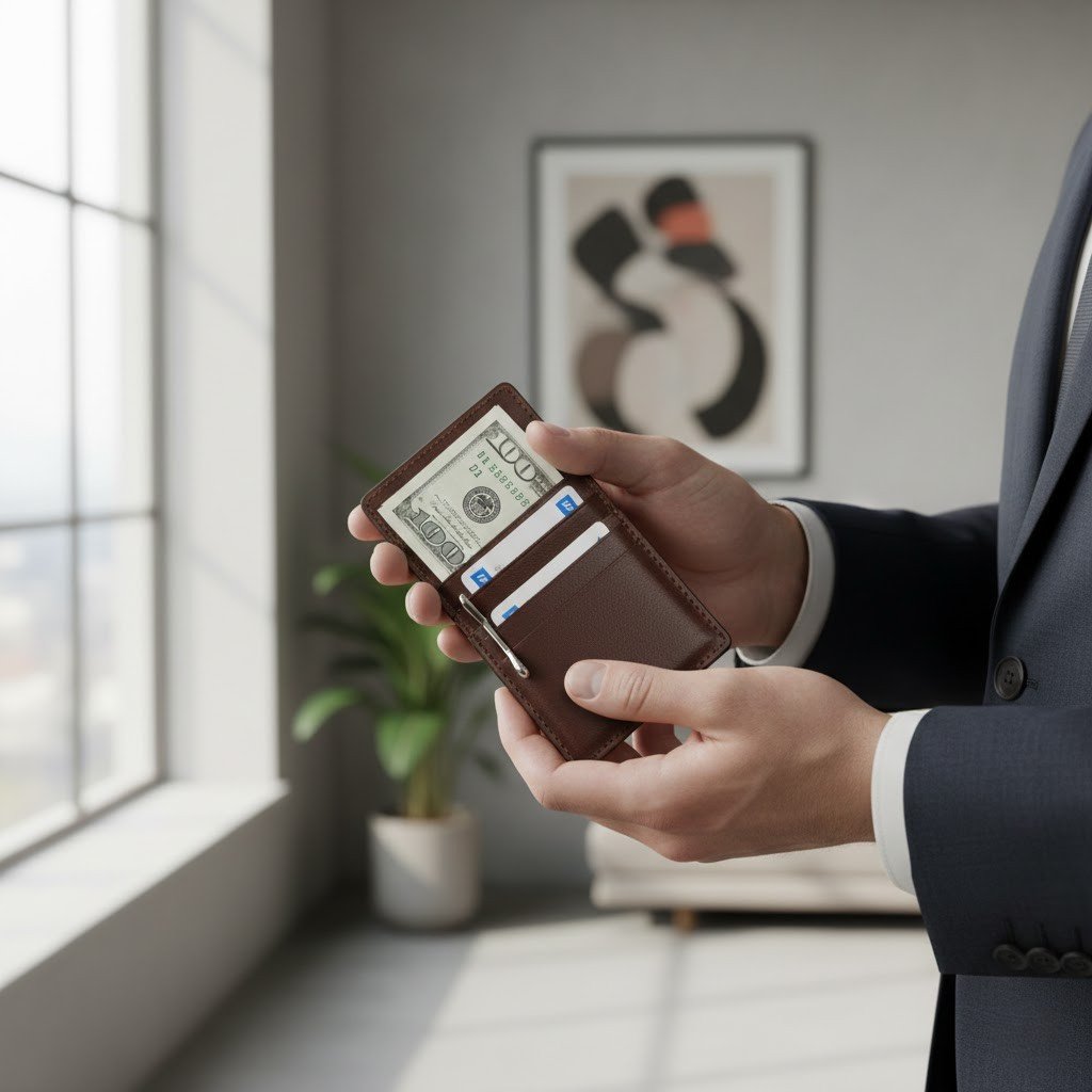 A money clip wallet combines a metal or leather clip with limited card slots. Bills remain folded and secured under the clip. Capacity stays low, which prevents overstuffing. This style fits users who handle cash daily and prefer quick access without a full bill compartment.