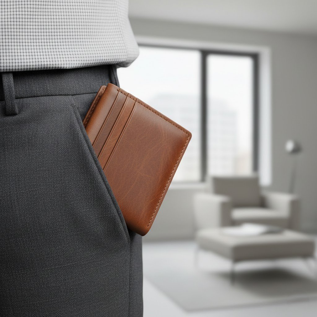 The slim wallet focuses on minimal carry. Most designs hold four to six cards and a small amount of folded cash. Reduced thickness lowers pressure on the lower back when seated for long periods. This option suits professionals who rely on digital payments and carry fewer physical items.
