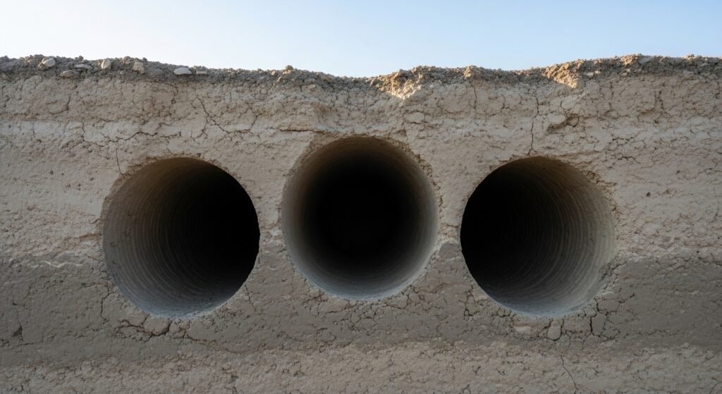 Each tunnel measures several centimeters wide and extends for meters underground. Wall surfaces show parallel grooves suggesting repetitive movement. Branch junctions follow predictable angles. Structural regularity suggests intentional formation rather than random erosion. Natural processes such as water flow fail to explain uniform depth and direction.