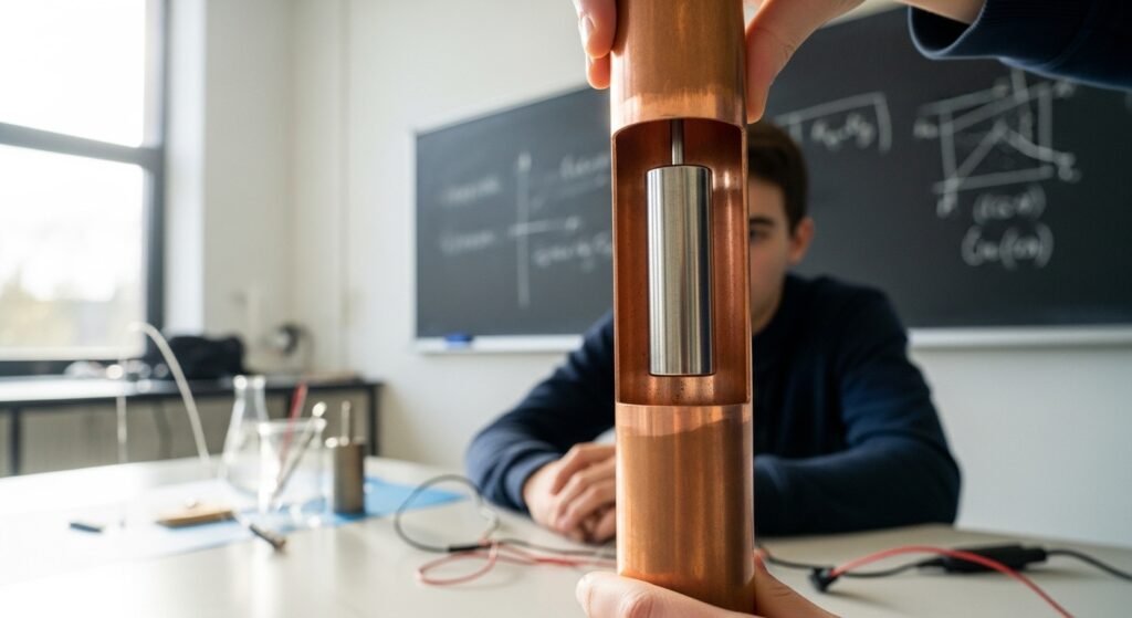 Dropping a magnet through a copper pipe produces a surprising effect. Instead of falling quickly, the magnet slows dramatically. The motion creates electric currents in the metal. These currents generate magnetic resistance that reduces the falling speed.