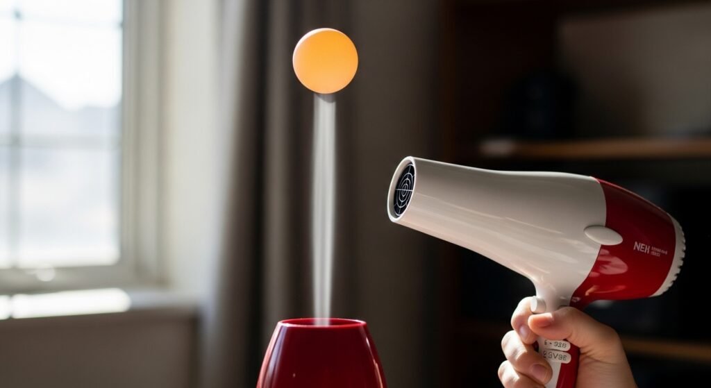 A ping-pong ball can float in a stream of air from a hair dryer. The fast-moving air creates lower pressure around the ball. Air pressure beneath keeps it balanced. This simple demonstration clearly illustrates fluid dynamics and the Bernoulli principle.