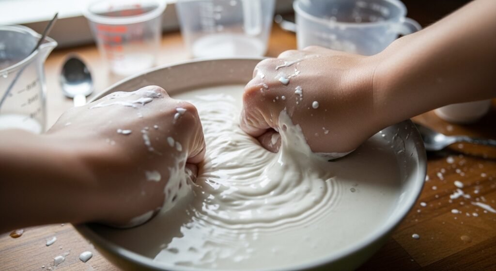 Mixing cornstarch with water creates a non-Newtonian fluid. When pressed quickly, the mixture feels solid. When touched gently, it flows like liquid. This unusual behavior demonstrates how some materials respond differently depending on applied force.