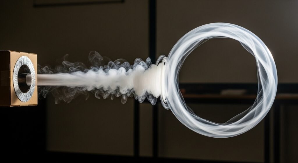 A vortex cannon pushes rings of air across a room. When smoke is added, the circular pattern becomes visible. The ring maintains its shape as it moves forward. This experiment demonstrates how rotating fluids create stable structures in motion.