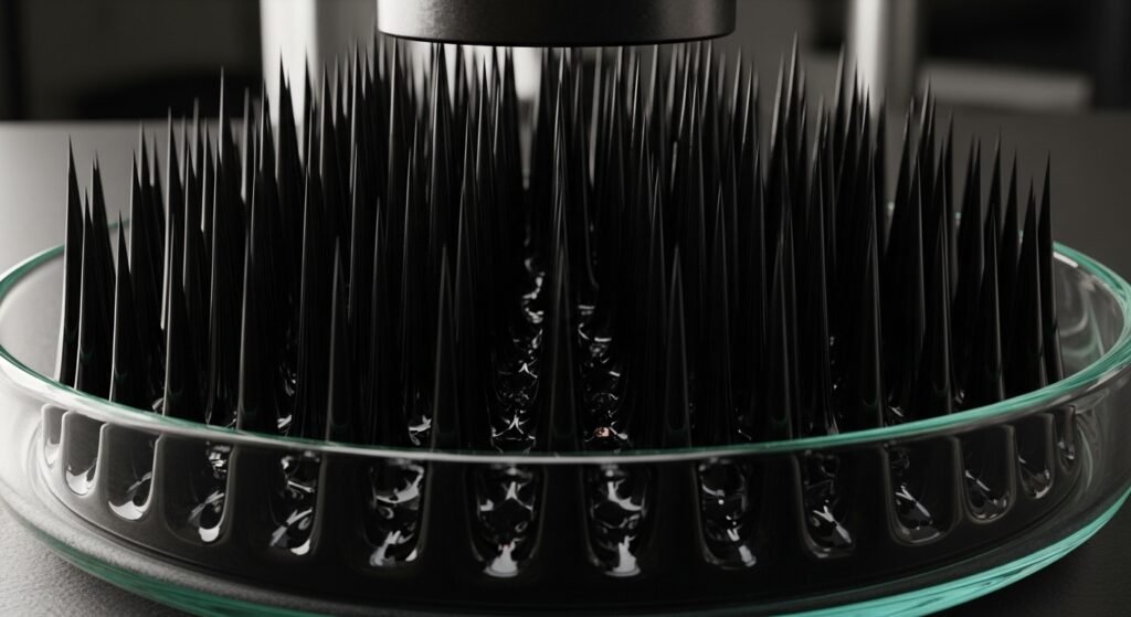 Ferrofluid contains tiny magnetic particles suspended in liquid. When placed near a magnet, sharp spikes form on the surface. The spikes shift with magnetic movement. This demonstration reveals the interaction between magnetic forces and fluid behavior.