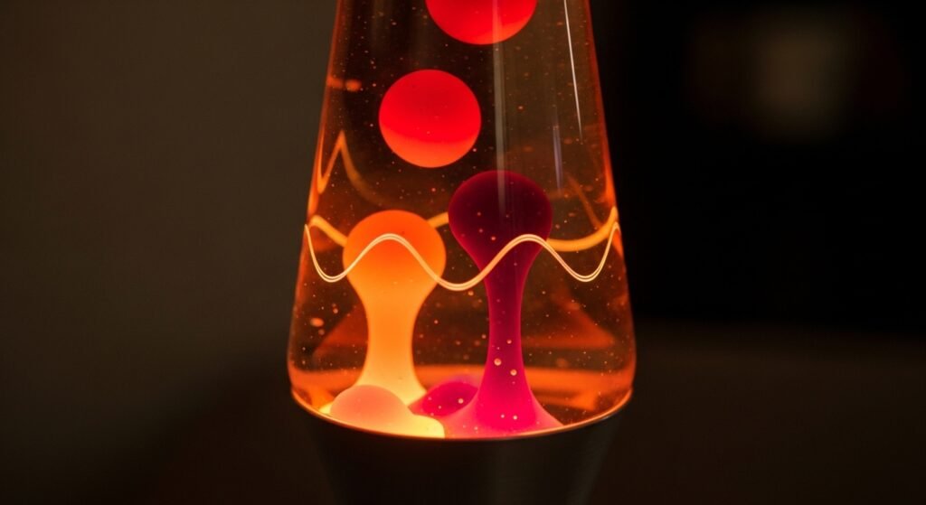 A lava lamp uses heat to move colored wax through liquid. As the wax warms, it becomes less dense and rises. When it cools, it sinks again. This cycle shows how temperature changes affect fluid density and motion.