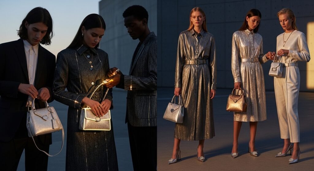 Subtly, metallic accents appear to be glowing. Rather than all-metal outfits, it may be the handbags, shoes, or minute details that do the job. The light is less glaring, yet it is noticeable.
