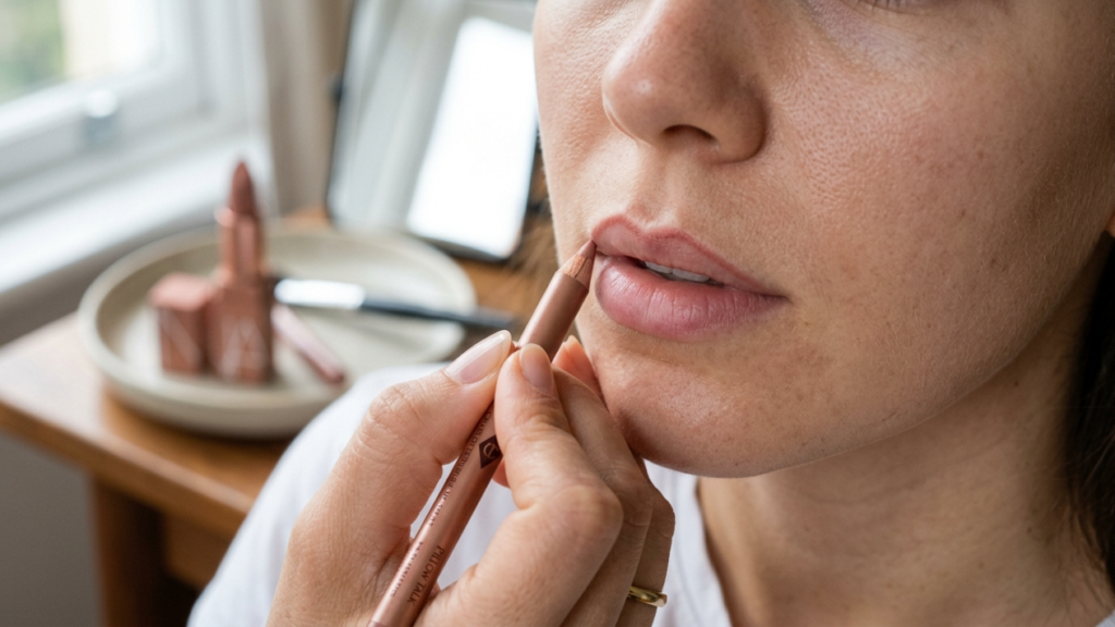 Using a lip liner close to your natural lip color or chosen nude shade helps define lips and prevent feathering. It also enhances shape and creates a more refined and structured finish for nude lipstick looks.