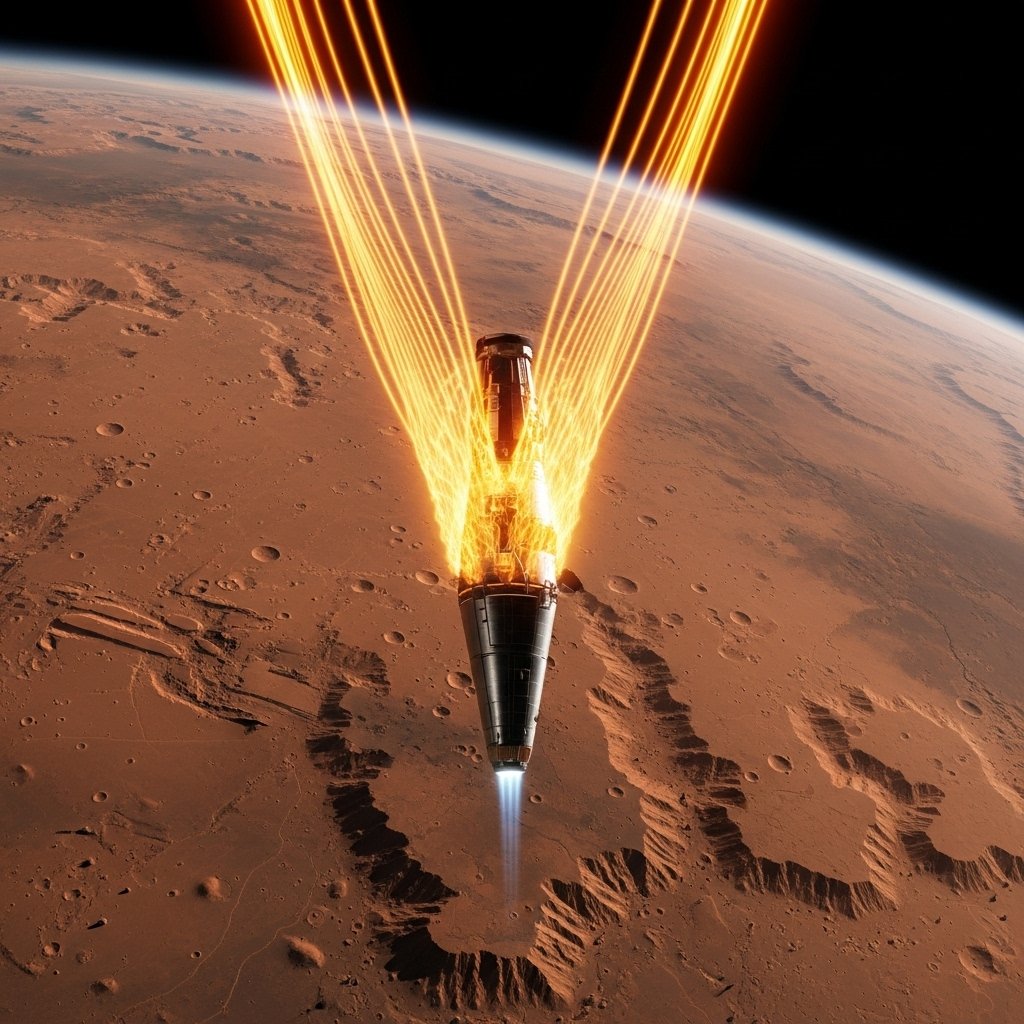 Mars entry presents challenges due to thin atmosphere. Starship uses a controlled belly first descent to slow speed through atmospheric drag. Adjustable flaps manage orientation and stability. Final landing relies on engine powered descent, which avoids parachute limitations at high vehicle mass.