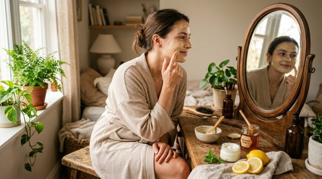 Use simple, natural face masks occasionally to nourish your skin. Ingredients like honey or yogurt can hydrate and brighten, giving your skin a refreshed and healthy look without harsh chemicals.