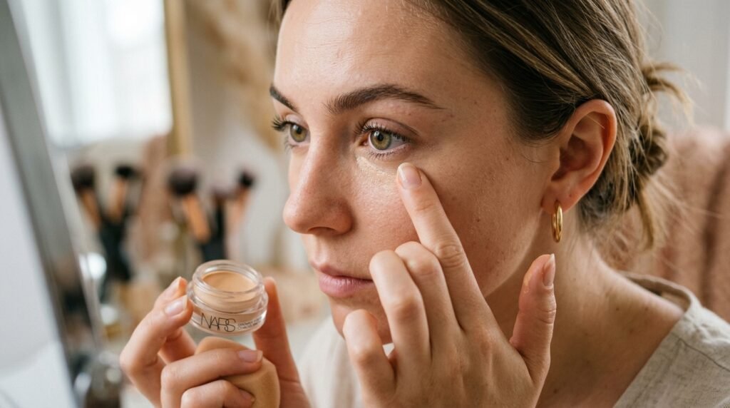 A creamy concealer helps cover dark circles and minor blemishes without settling into fine lines. It brightens the under-eye area and creates a more refreshed look instantly.