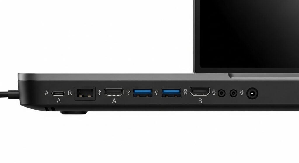 Ports include USB A, USB C, HDMI, and audio output. Port placement along the rear limits cable visibility from the front. Lack of expandable internal storage reduces flexibility. External drives serve as the primary option for capacity growth.