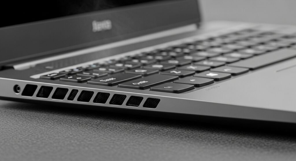 Cooling vents sit along the rear edge of the keyboard housing. Fan noise stayed low in quiet rooms during standard use. Heat buildup remained localized near the top edge. Lap use feels impractical due to warmth and weight concentration.