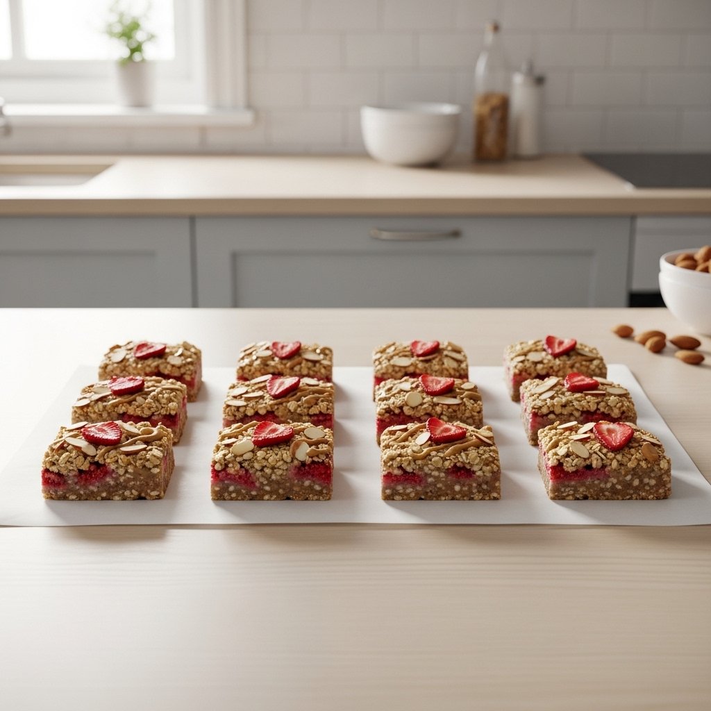 The bars will be made up of a simple carbohydrate of oats, protein in almond butter, and moderate amounts of natural sugars in strawberries. The protein content of a typical homemade bar of 40 grams weight can be as much as 5 to 7 grams. This macronutrient ratio aids in satiety and maintains hunger in between meals.