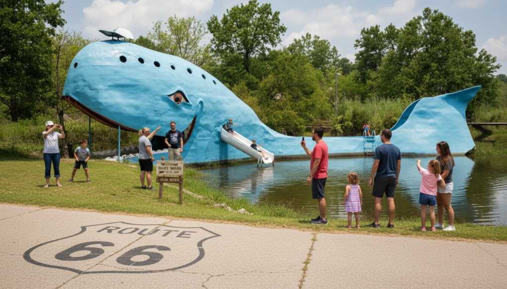 One of the most beloved attractions along historic Route 66 is the giant Blue Whale in Oklahoma. Built in the early 1970s, it once served as a swimming spot and remains a cheerful landmark for travelers today.