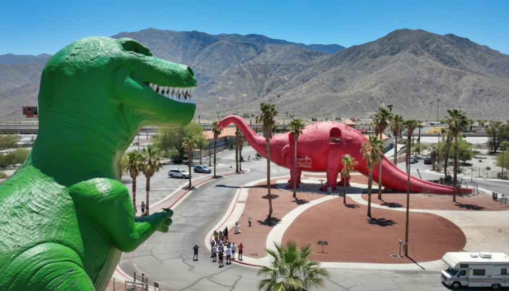 Standing beside a desert highway in California, the Cabazon Dinosaurs have been greeting travelers since the 1960s. These giant dinosaur sculptures became famous for their size and playful design, offering visitors a nostalgic roadside experience and memorable photo opportunity.