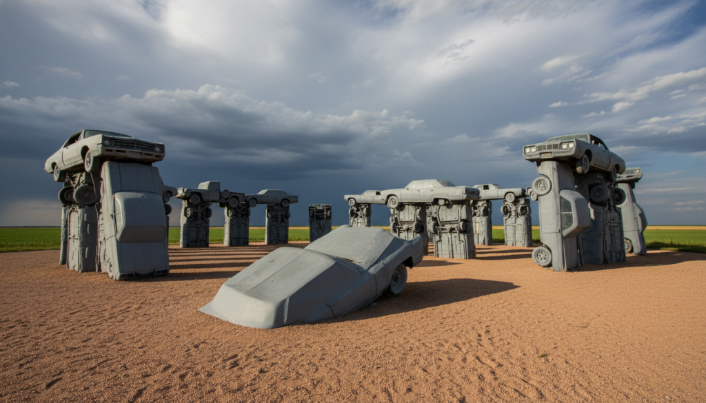 In Texas, visitors encounter a row of vintage cars half-buried nose-first into the ground. Created in the 1970s, Cadillac Ranch became a cultural symbol of American creativity and continues to attract travelers along the highway.