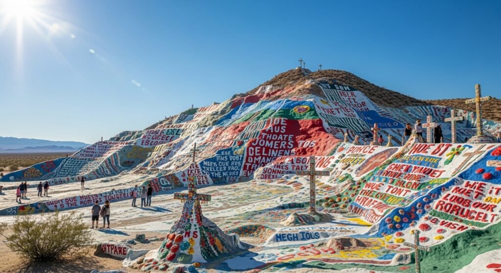 In the California desert stands a colorful hillside painted with inspirational messages and bright designs. Salvation Mountain has become a unique landmark where visitors admire the artwork and the dedication behind its creation.