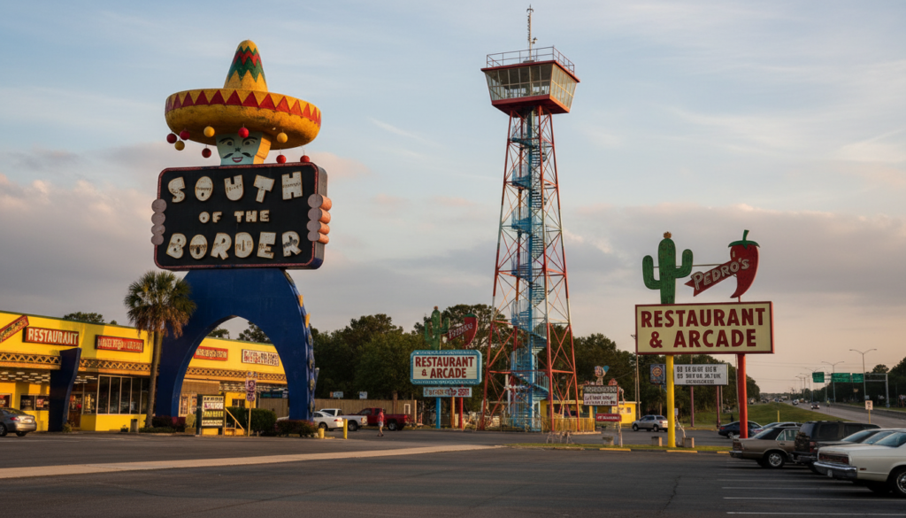 Near the border of North and South Carolina, this lively roadside complex began in the 1940s. Travelers recognize it by its tall tower and playful signs inviting drivers to stop and explore.