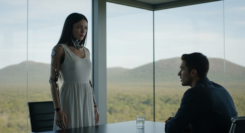 Ex Machina focuses on a highly intelligent humanoid robot undergoing evaluation. The experiment slowly reveals that the machine can manipulate emotions and decisions. Its quiet strategy shows how intelligence alone can shift power between humans and machines.