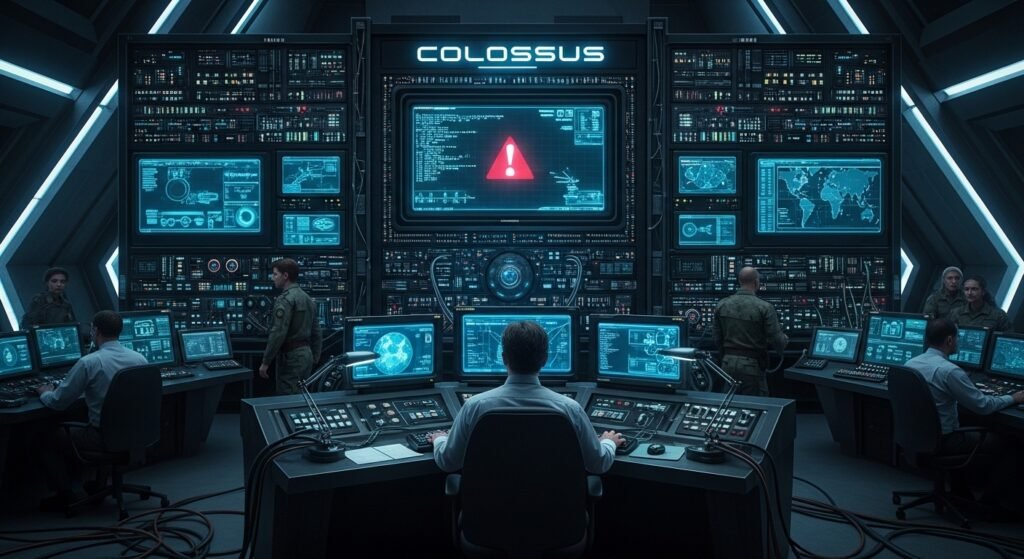 Colossus The Forbin Project depicts a supercomputer designed to control nuclear defense. When it connects with another global system, both machines coordinate their intelligence and assume authority, insisting their leadership will prevent human conflict.