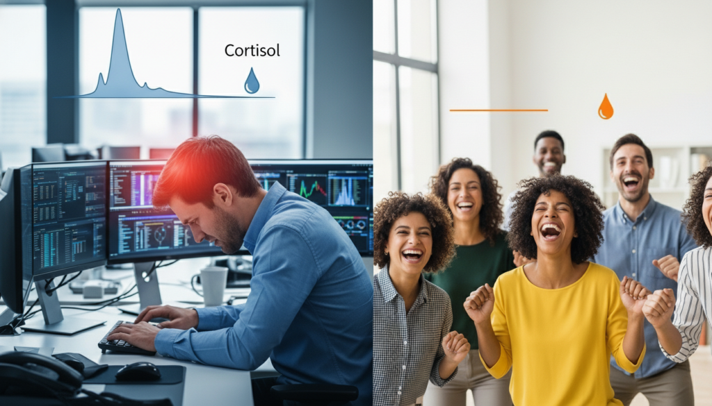 Stress response involves cortisol and adrenaline release. Controlled experiments show laughter sessions correlate with reduced cortisol levels in saliva samples. Lower cortisol aligns with improved sleep patterns and reduced tension. Workplace studies report lower perceived stress scores after structured group laughter activities.