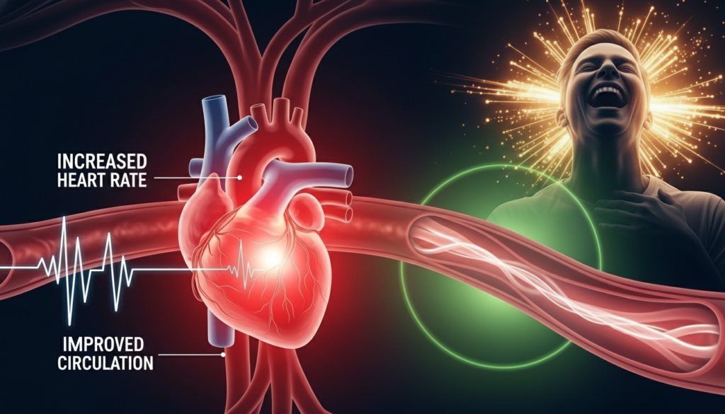 Heart rate and blood vessel activity change during laughter. Short bursts of laughter raise heart rate, followed by muscle relaxation and improved circulation. Clinical observations note improved endothelial function after laughter exposure, similar in direction to light aerobic activity, though intensity remains lower.